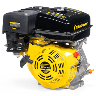 Двигатель Champion G270-1HK с ручным стартером имеет рабочий объем 270 куб. см. и максимальную мощность 9 л.с. Оснащен топливным баком емкостью 6,5 литров. Горизонтальное расположение вала двигателя, диаметр составляет 25,4 мм.